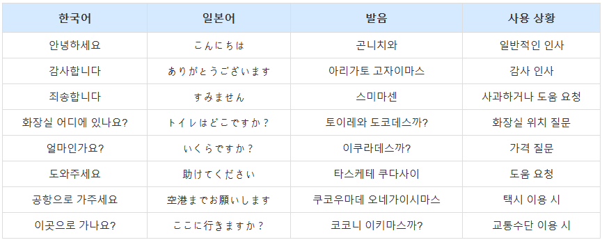 여행 중에 유용하게 쓸 수 있는 기본적인 한국어와 일본어 표현을 정리한 표입니다. 공항이나 대중교통에서 활용할 수 있으니 참고해 보세요! 😊