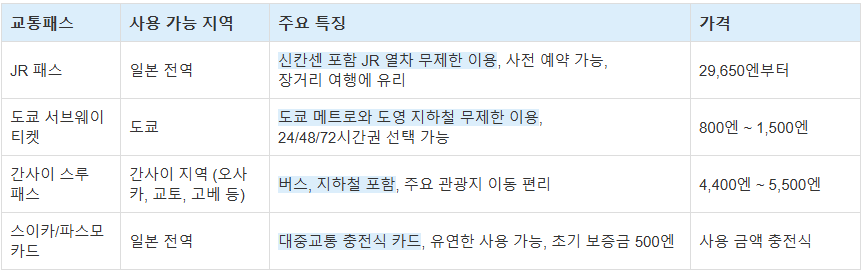 이 표를 참고해 여행 계획에 맞는 교통패스를 선택해 보세요. 😊 적합한 패스를 고르면 여행이 더욱 편리하고 즐거워질 거예요!
